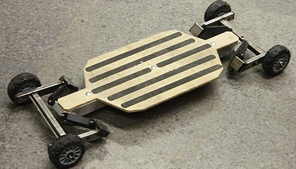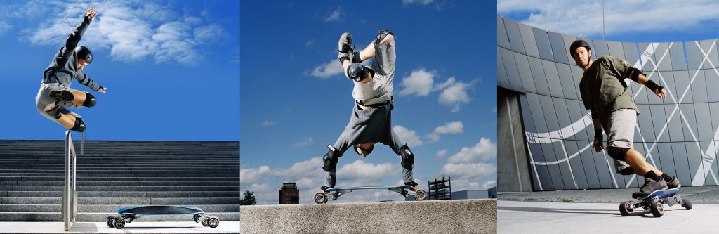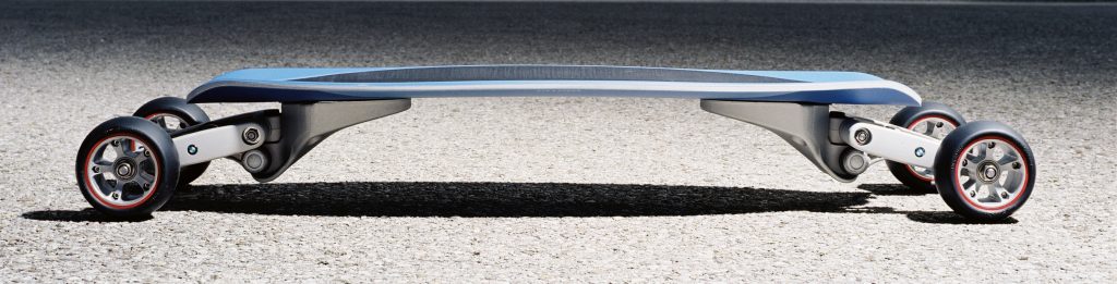 The first boards had only 2 wheels and used rubbers to reset the wheels. Soon after he had the idea to replace the rubbers with intelligent kinematics, which utilized the body weight as a restoring force. This gave birth to a variety of concepts.